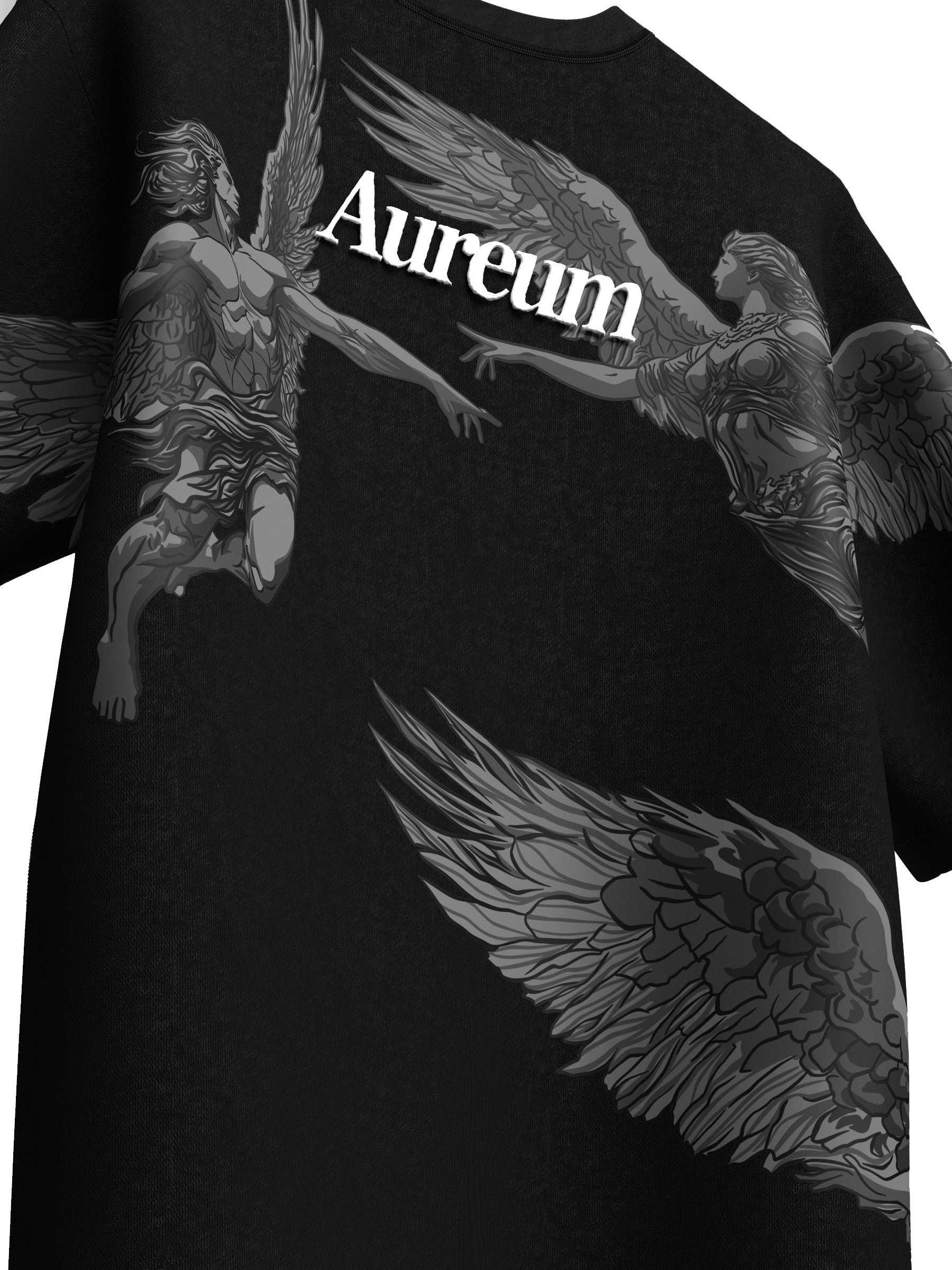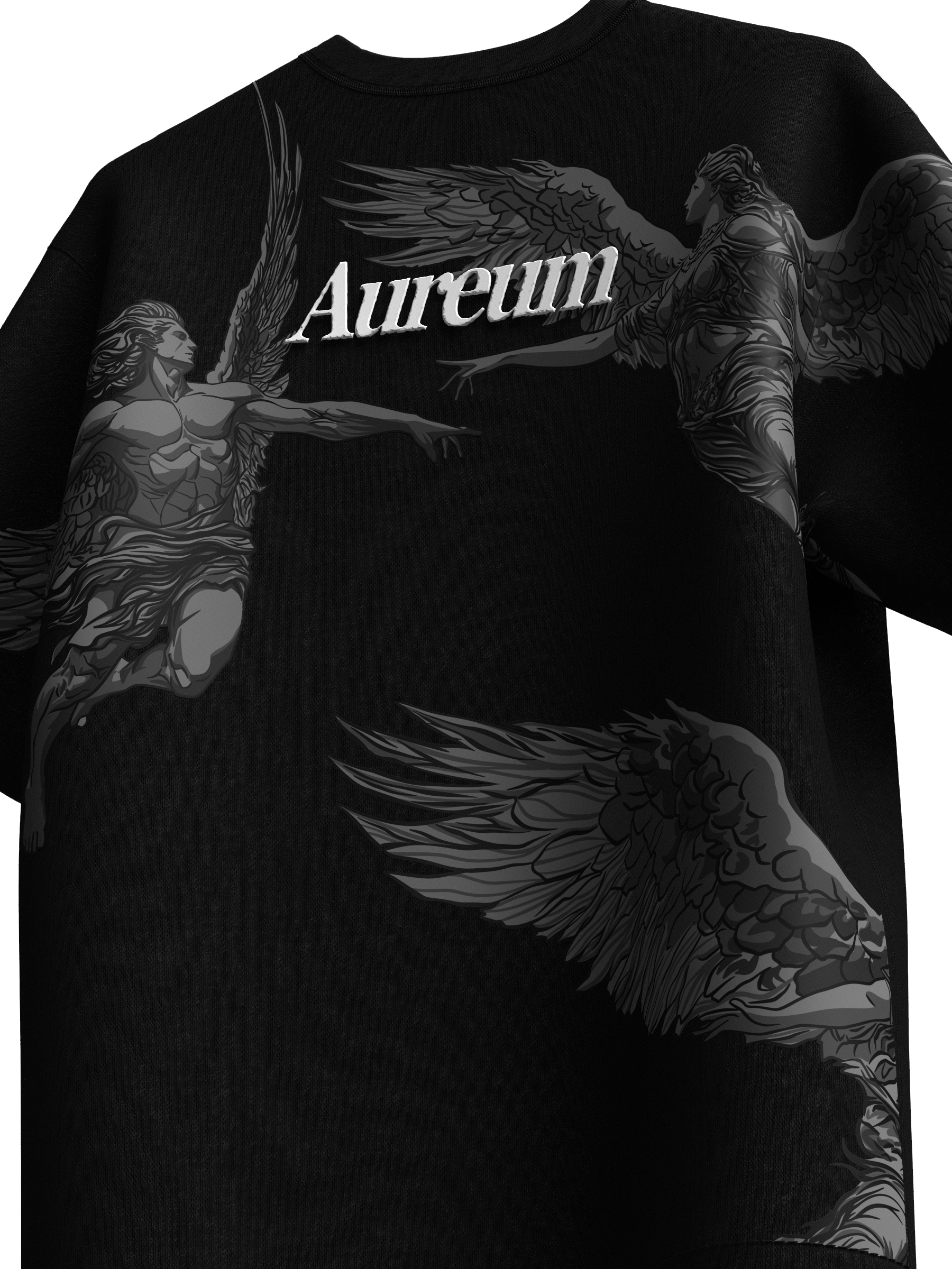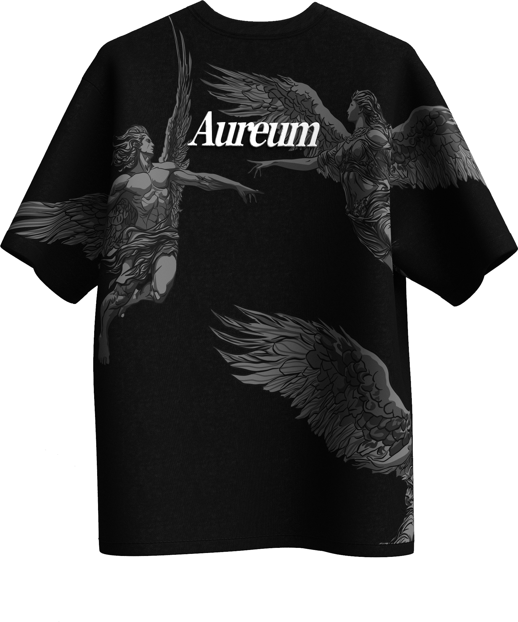 Ascend beyond the ordinary with the AUREUM Celestial Guardians Tee. Draped in black, this oversized piece showcases two colossal angels in motion, their wings unfurling in intricate detail across the fabric. The bold Aureum wordmark sits at the center, balancing the divine imagery with modern minimalism.