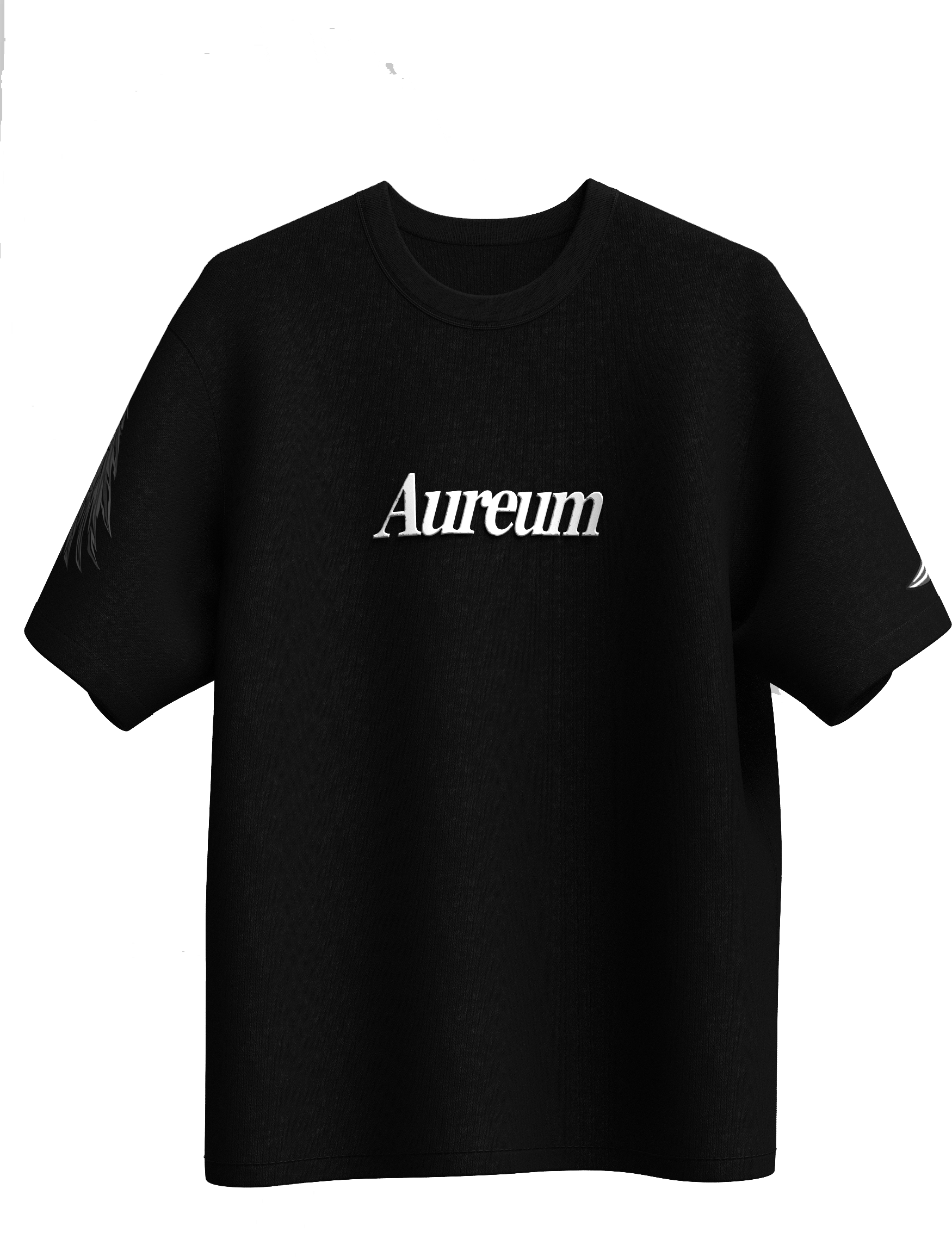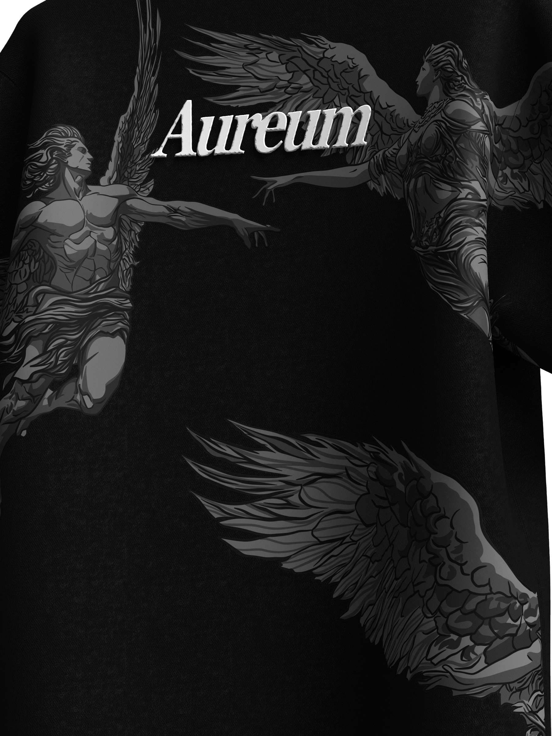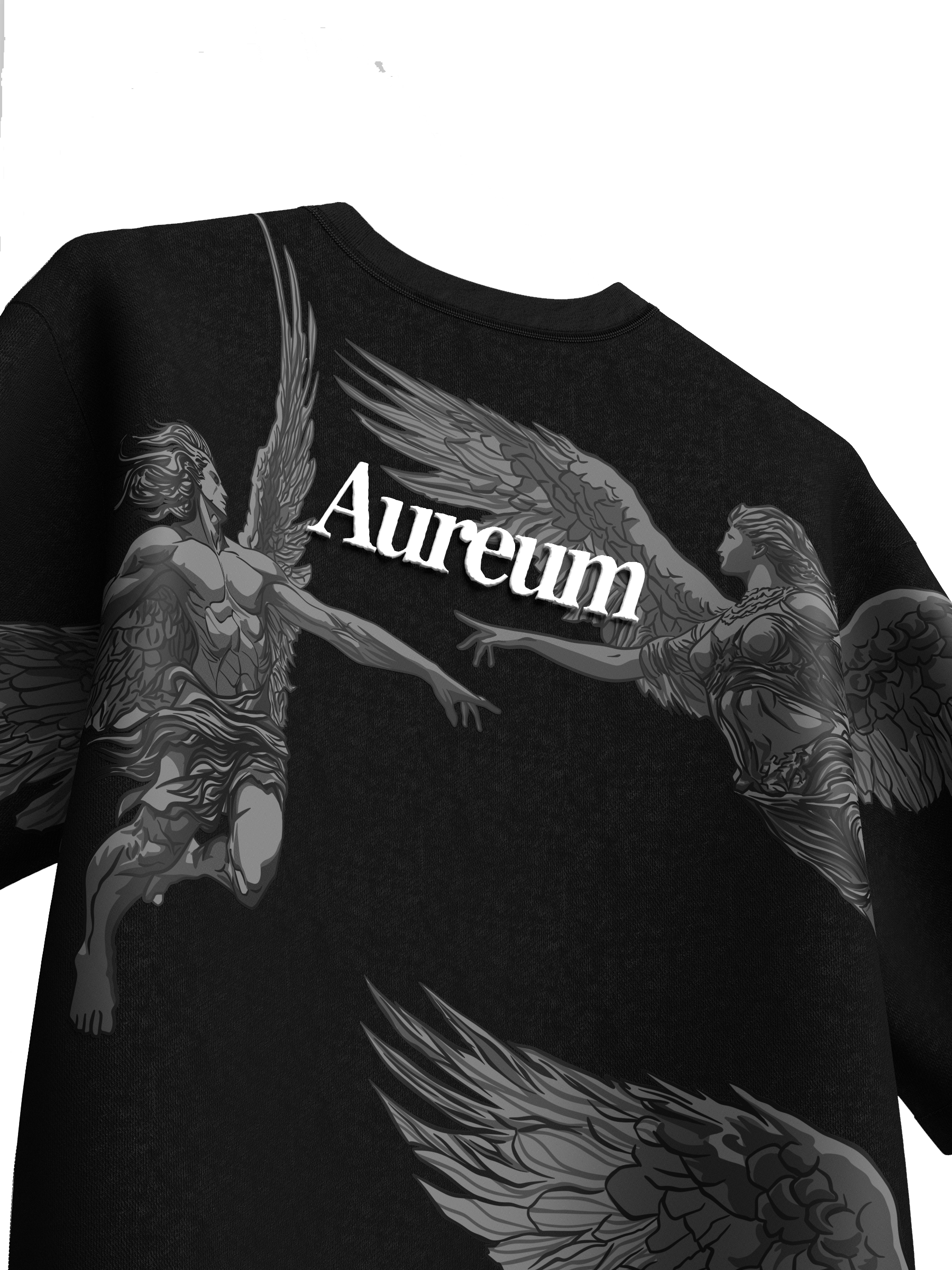 Ascend beyond the ordinary with the AUREUM Celestial Guardians Tee. Draped in black, this oversized piece showcases two colossal angels in motion, their wings unfurling in intricate detail across the fabric. The bold Aureum wordmark sits at the center, balancing the divine imagery with modern minimalism.