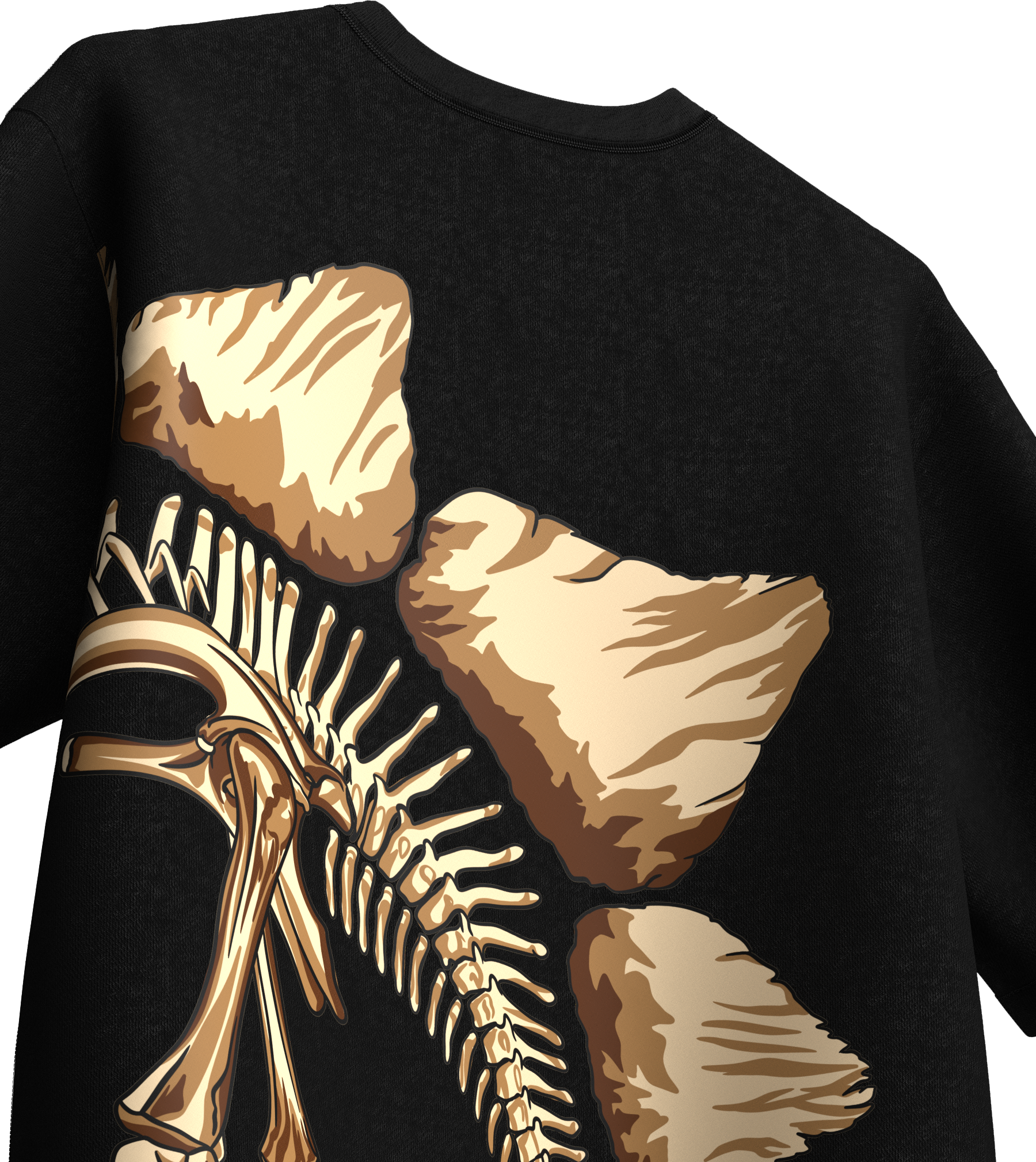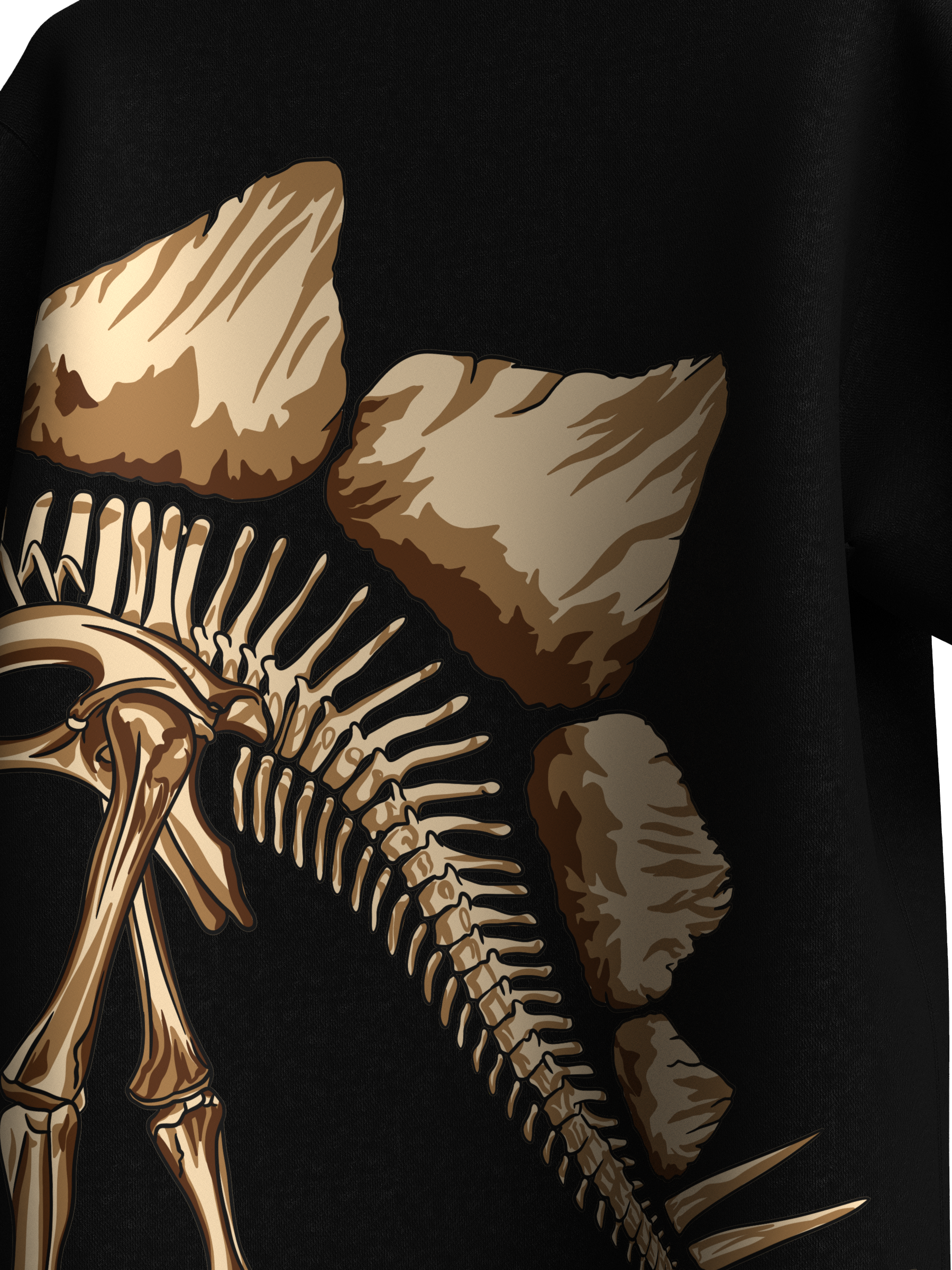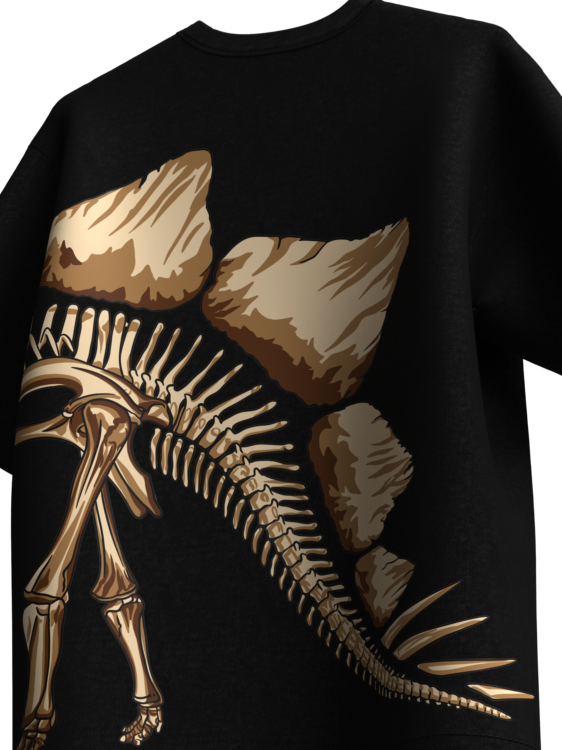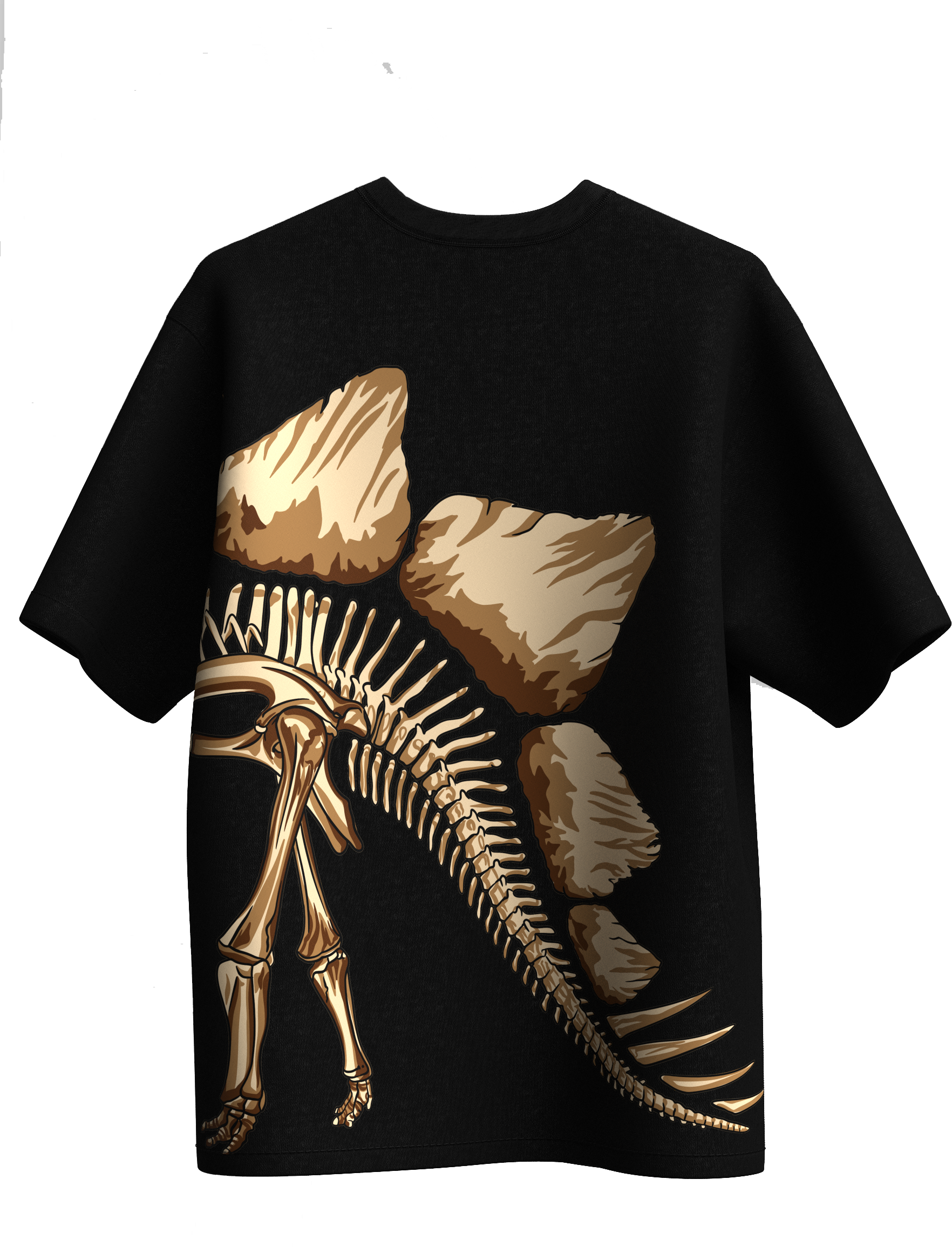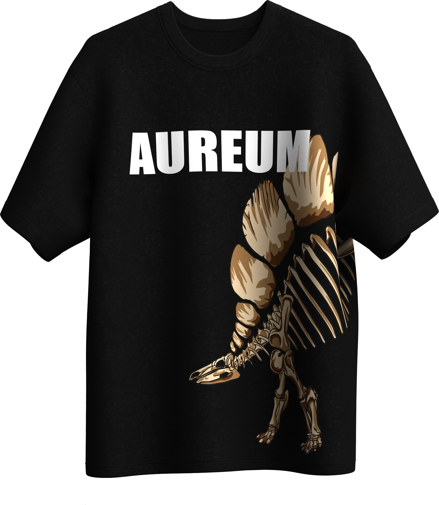 Step into prehistoric gold with the AUREUM Fossil Tee. Featuring a striking skeletal dinosaur graphic that wraps across the side, this oversized black tee blends streetwear energy with ancient history. The bold AUREUM print on the chest commands attention, while the detailed bone-and-plate artwork adds depth and edge.