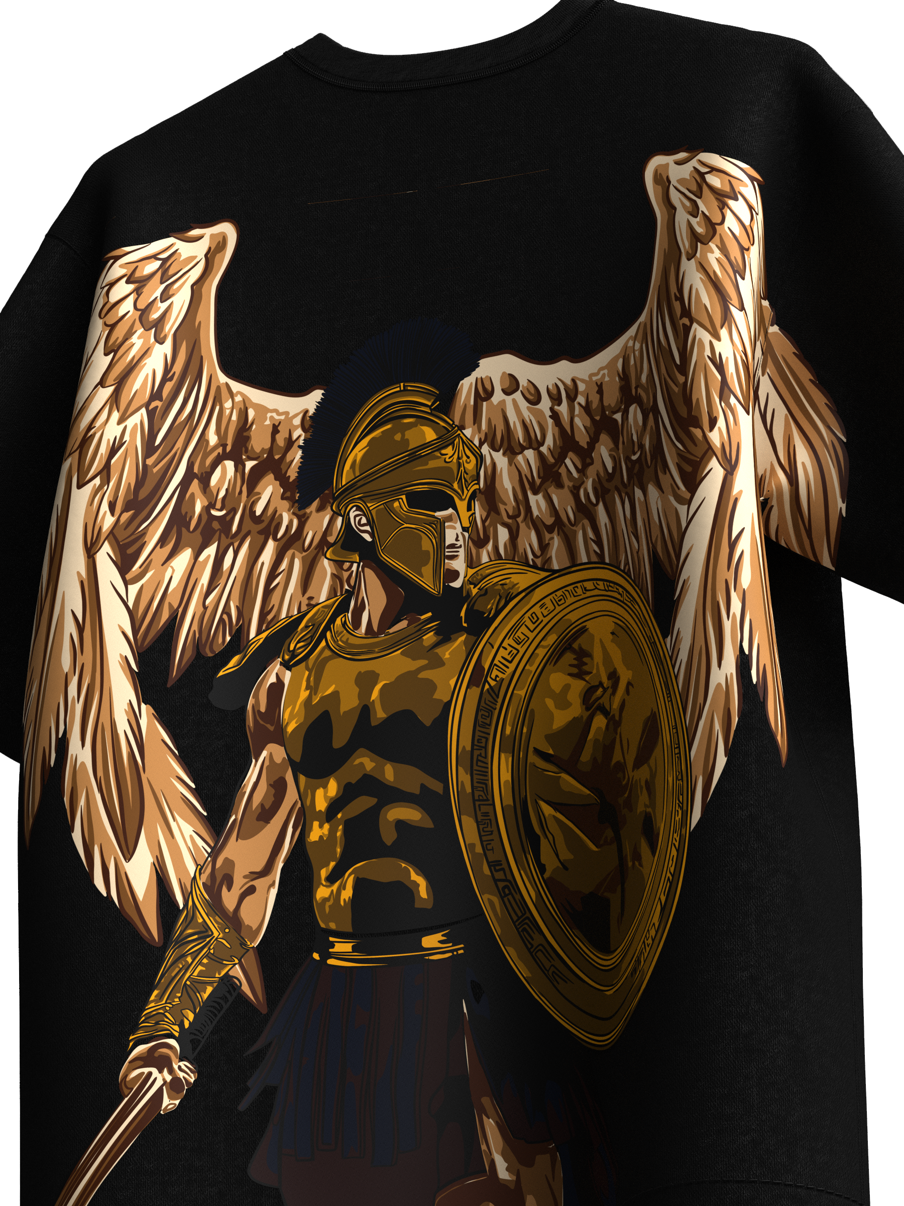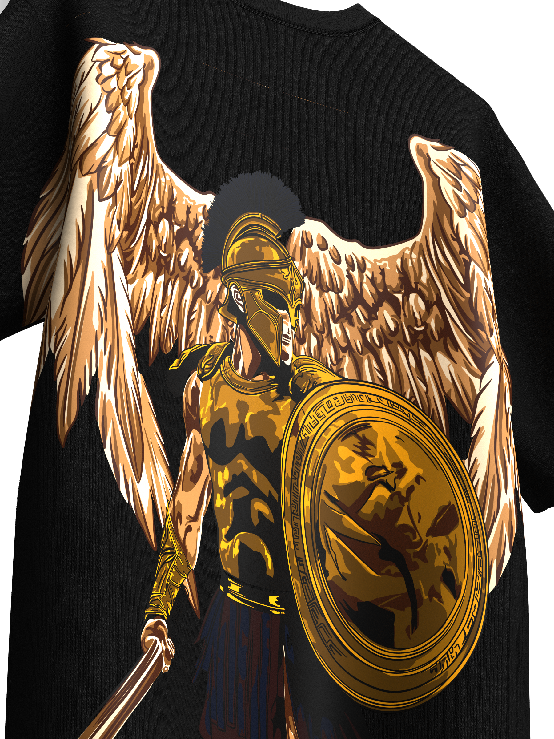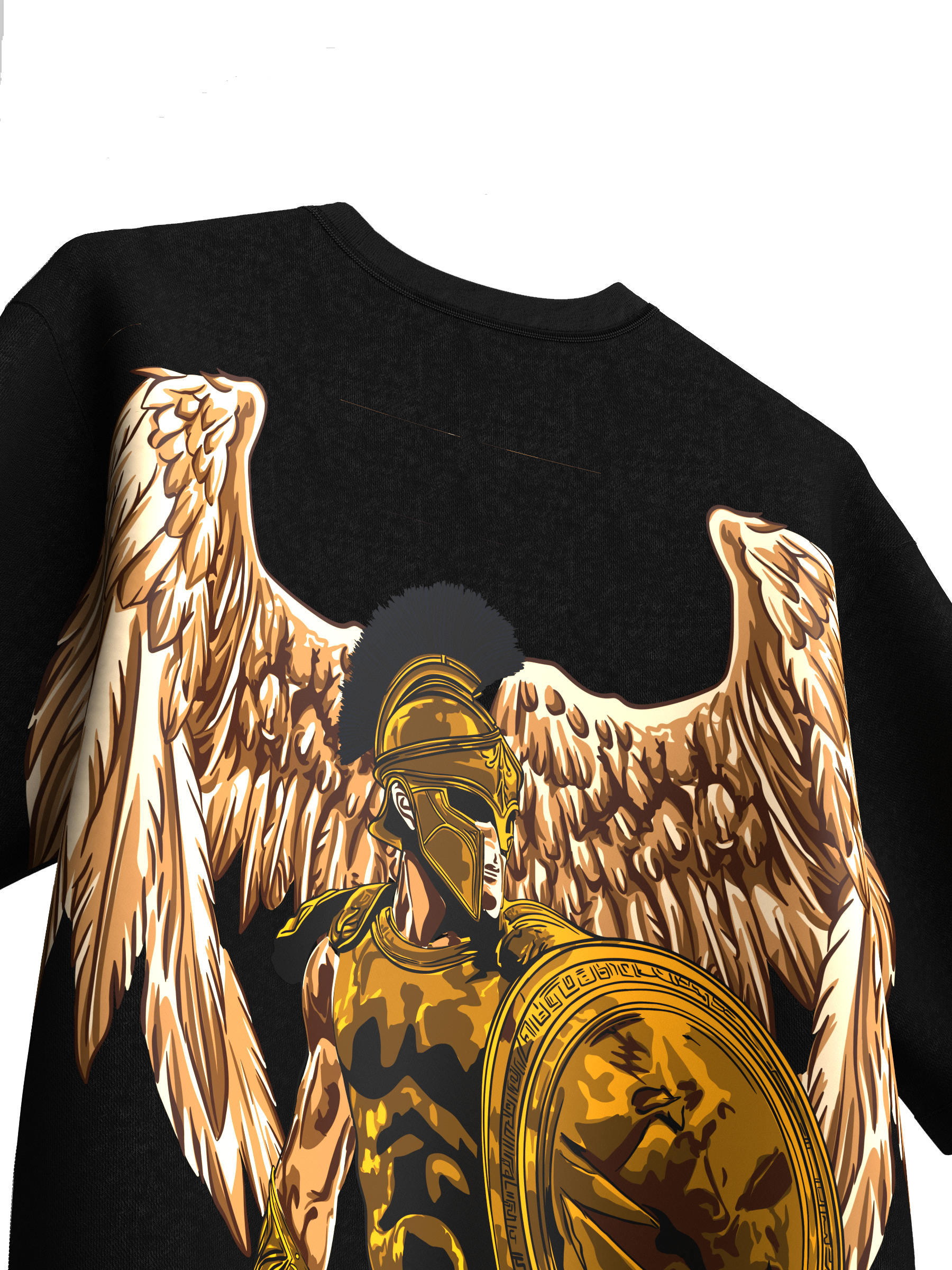 Strength takes flight in the AUREUM Winged Warrior Tee. Commanding the back of the tee, a golden-armored gladiator stands shielded and ready, his immense wings stretching wide in shades of bronze and gold. The design radiates raw power and divine protection, blending mythological grandeur with modern streetwear aesthetics.