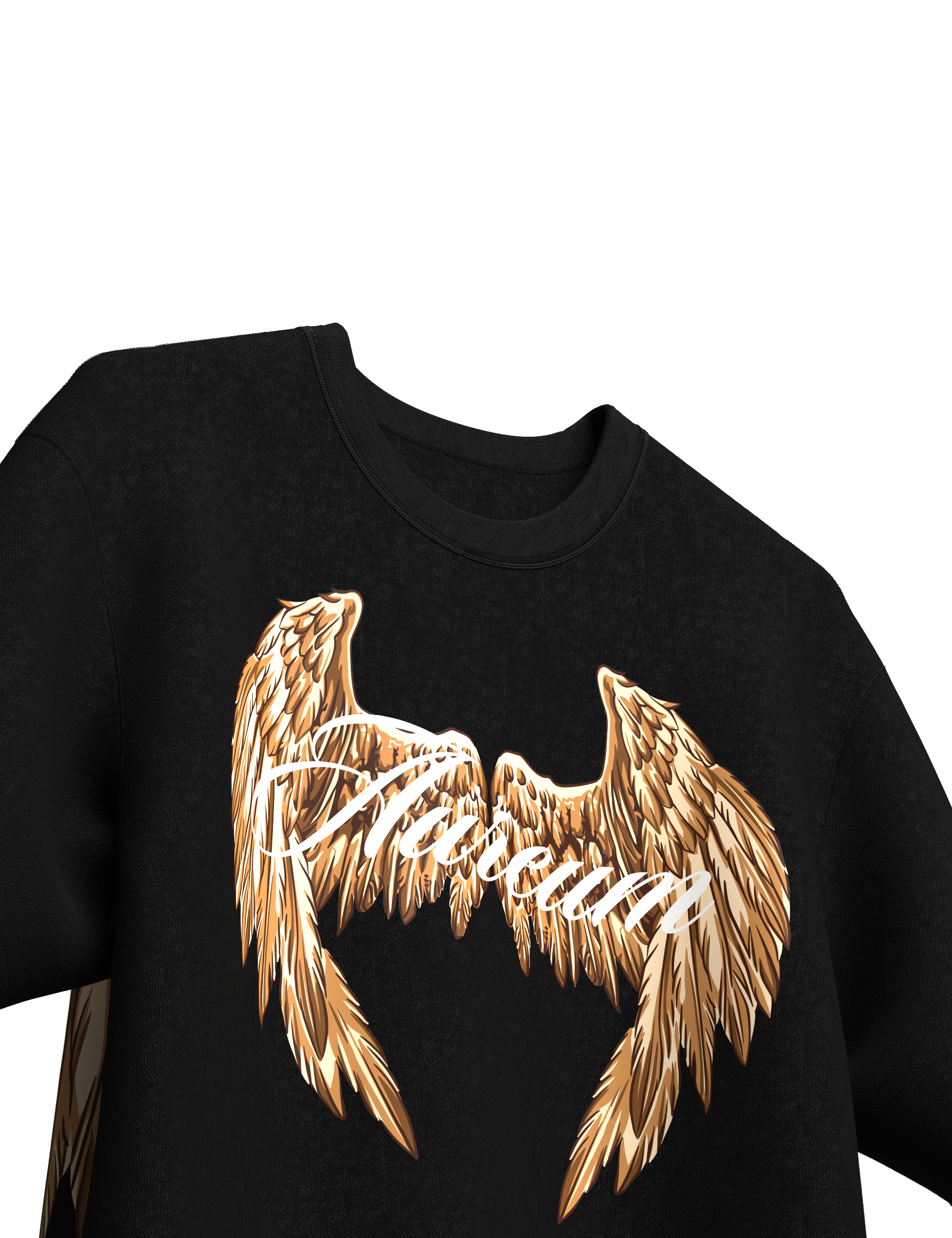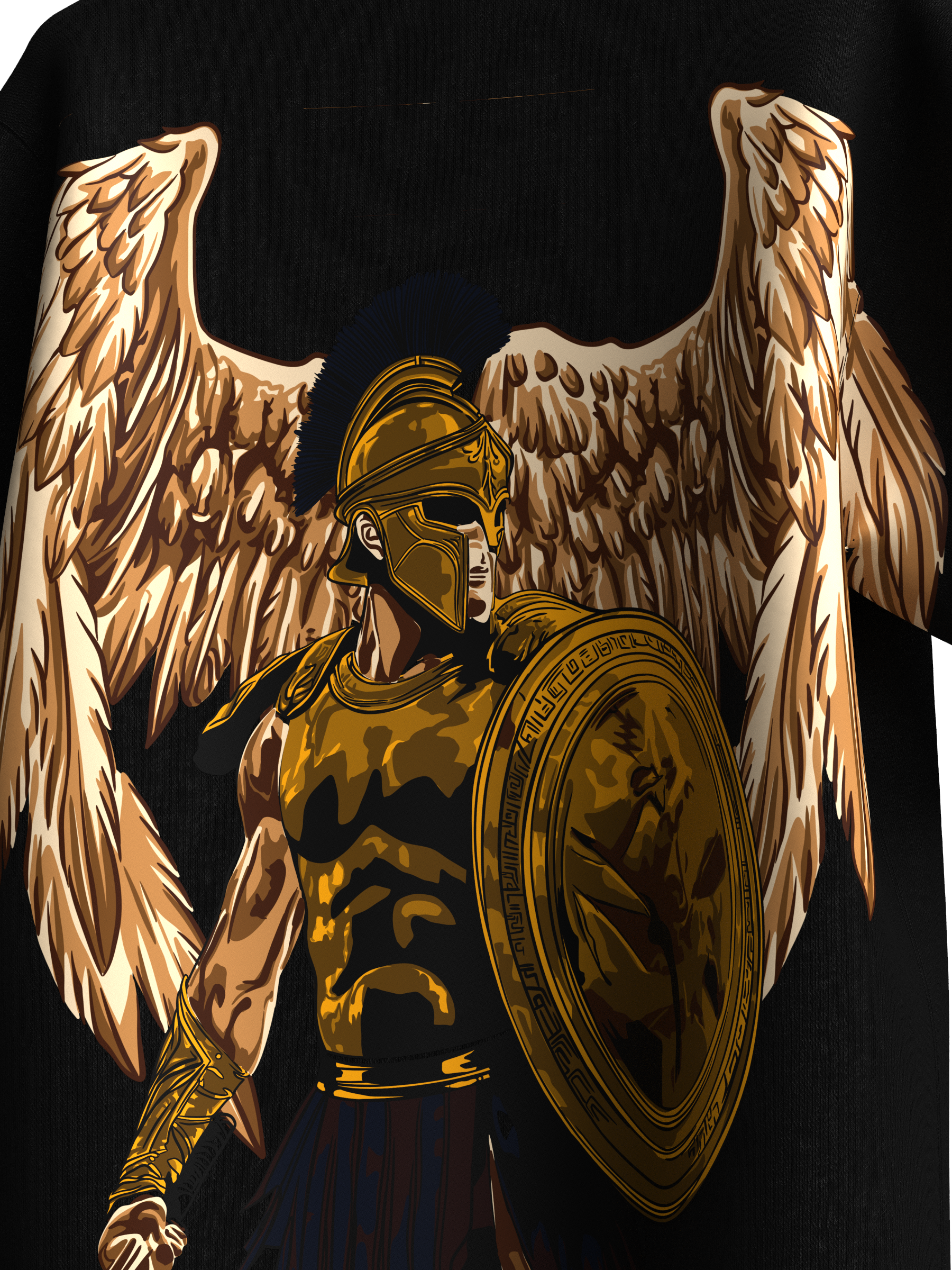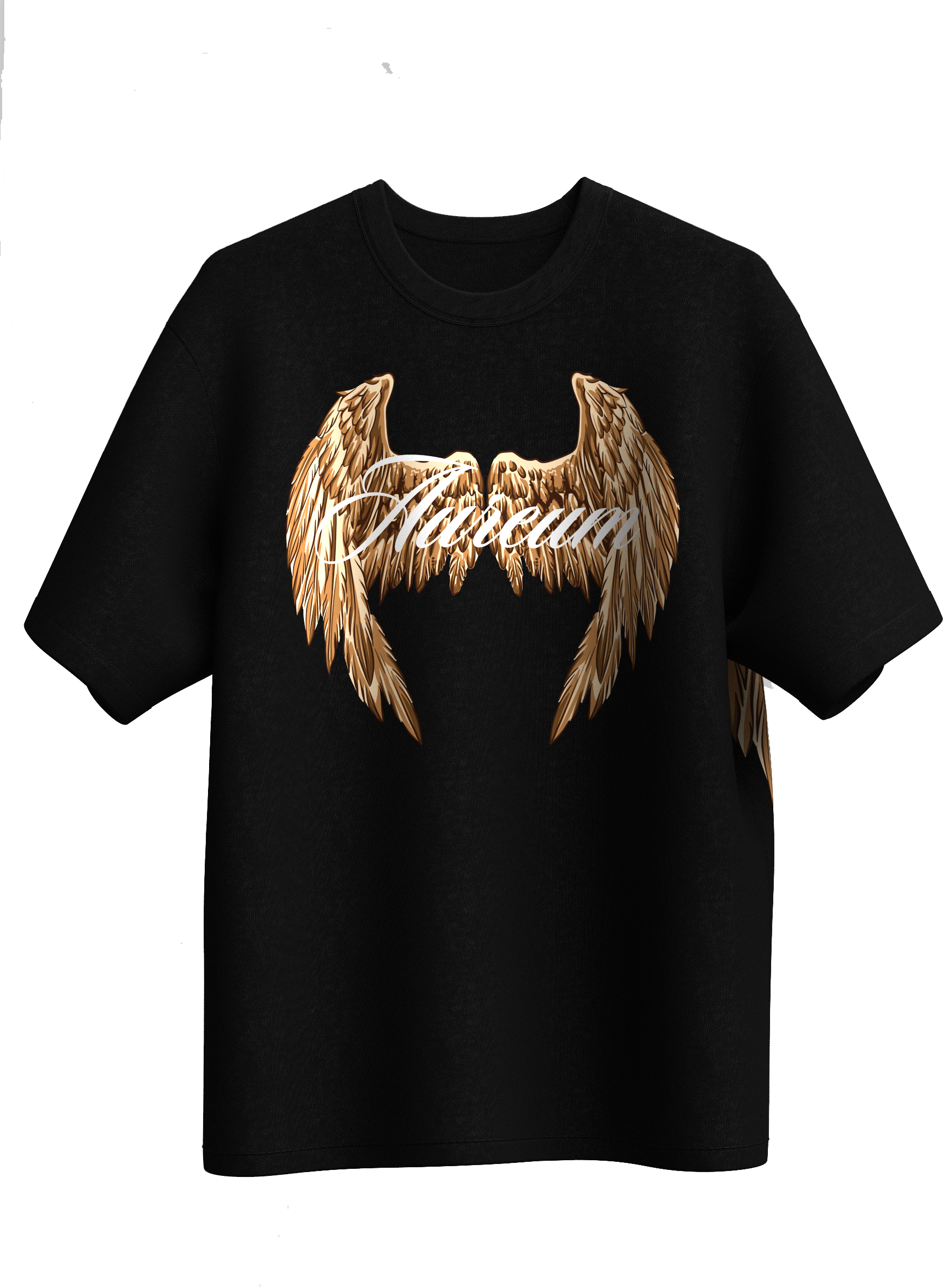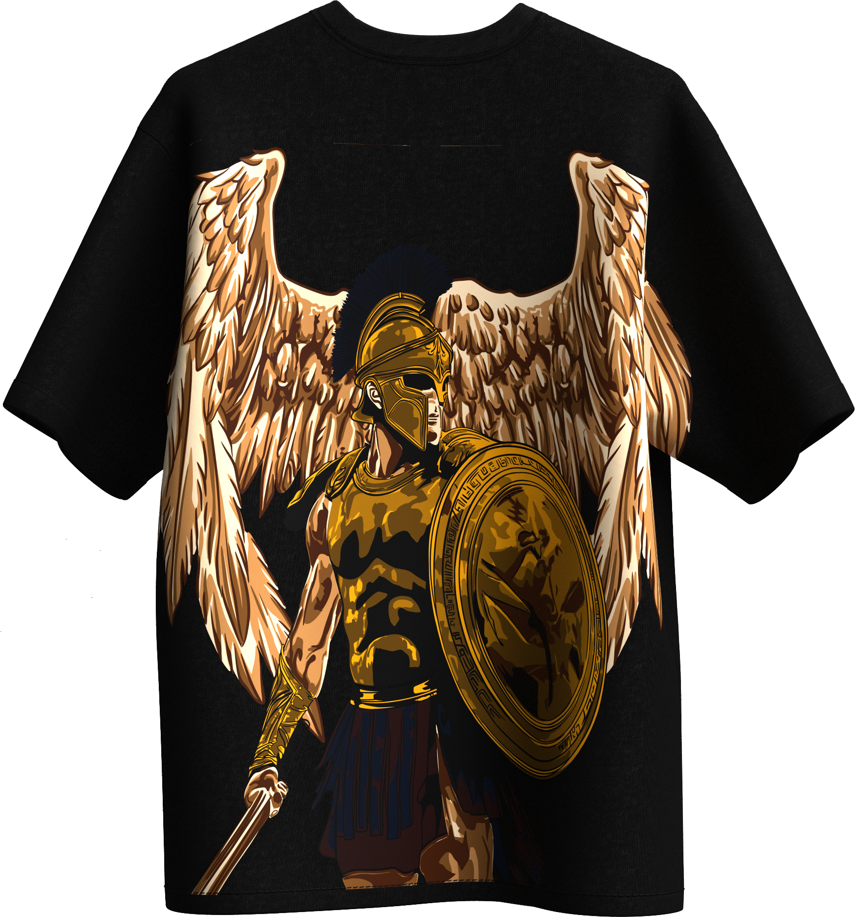 Strength takes flight in the AUREUM Winged Warrior Tee. Commanding the back of the tee, a golden-armored gladiator stands shielded and ready, his immense wings stretching wide in shades of bronze and gold. The design radiates raw power and divine protection, blending mythological grandeur with modern streetwear aesthetics.